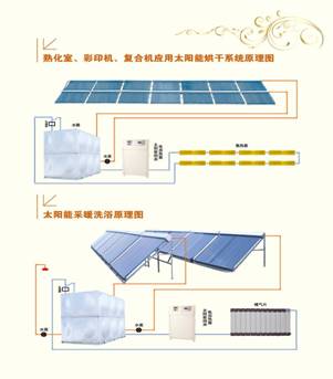 本公司研發(fā)的這套系統(tǒng)是利用太陽能的輻射,將陽光聚合,并運(yùn)用其能量通過集熱管對水進(jìn)行加熱產(chǎn)生熱能,經(jīng)過管道輸送進(jìn)入保溫水箱,然后將水箱里面的熱水輸送至機(jī)械的進(jìn)風(fēng)口及熟化室通過散熱器將熱能輸出,從而對產(chǎn)品進(jìn)行烘干、固化,替代用電加熱的效果。