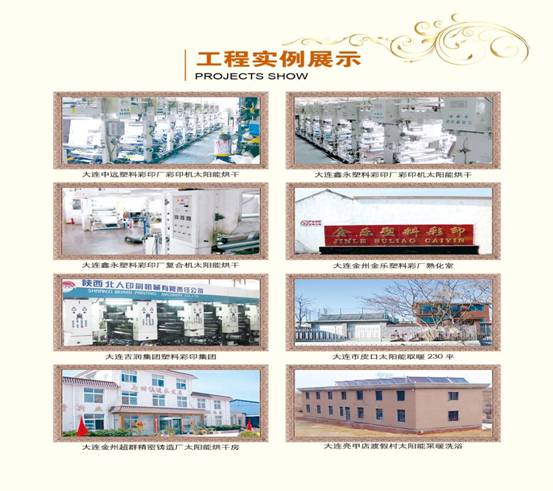 幾年來,我公司已經(jīng)為大連吉潤塑料彩印集團(tuán)、大連中遠(yuǎn)塑料彩印廠、大連鑫永塑料彩印廠、大連金州金樂塑料廠、大連中源塑料制品有限公司、南京索特包裝制品有限公司等包裝企業(yè)在印刷機(jī)、復(fù)合機(jī)設(shè)備及熟化室的烘干系統(tǒng)安裝了太陽能。通過安裝這套系統(tǒng),可以確保熟化恒溫達(dá)到50~55℃。不但節(jié)能減排效果明顯,實(shí)現(xiàn)了環(huán)境無污染,而且降低成本,節(jié)約能源達(dá)60%以上,受到企業(yè)普遍歡迎。