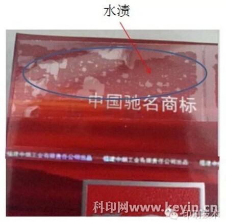 高溫燙熨工藝對(duì)煙包墨層的耐溫性提出了較高的要求。如果墨層的耐溫性較低,在高溫燙熨下墨層會(huì)變軟,經(jīng)輸送軌道的擠壓后極易導(dǎo)致墨層與BOPP薄膜產(chǎn)生粘連,形成高光亮的斑塊,即“水漬”。