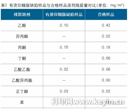 抽取有燙印糊版缺陷的產(chǎn)品與合格產(chǎn)品進(jìn)行溶劑殘留量檢測(cè),對(duì)比數(shù)據(jù)見(jiàn)表2。從表2中可以看出,有燙印糊版缺陷樣品的溶劑殘留量是合格樣品的8.41倍。這是因?yàn)殡娀X箔中溶劑殘留量高,會(huì)降低膠黏層的Tg值,導(dǎo)致膠黏層的熔點(diǎn)下降。在相同溫度、壓力、燙印速度條件下,當(dāng)色層、鍍鋁層的轉(zhuǎn)移面積增大時(shí),就容易出現(xiàn)燙印糊版缺陷。