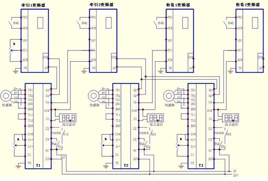 每一段張力控制系統(tǒng)由張力傳感器、張力控制器、變頻器等組成,張力傳感器安裝在導(dǎo)輥上,將檢測(cè)到的薄膜張力信號(hào)傳輸給張力控制器,經(jīng)放大、運(yùn)算調(diào)節(jié)后輸出模擬量信號(hào)(0~10V或4~20MA)直接驅(qū)動(dòng)變頻器,調(diào)整電機(jī)轉(zhuǎn)速,從而達(dá)到控制張力的目的。