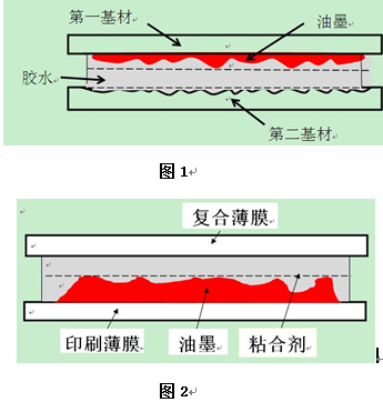 任何看起來(lái)很光滑的表面(如PET、BOPP、NY、 PE、 CPP、鍍鋁薄膜、鋁箔等),用放大鏡觀察,都可以發(fā)現(xiàn)是凹凸不平的。尤其是印刷后的油墨表面更是凹凸不平且多孔隙。復(fù)合時(shí),首先要用膠粘劑將復(fù)合基材本身的凹凸不平和油墨表面的凹凸不平、眾多的孔隙填平,同時(shí)還要在油墨的表面形成一定厚度的粘合劑層,這樣才能將需要復(fù)合的二層基材牢固地粘合在一起。需要膠黏劑的量就是所謂的上膠量。膠少或沒(méi)膠的地方就容易出現(xiàn)氣泡或白點(diǎn)現(xiàn)象。(如圖1圖2所示)