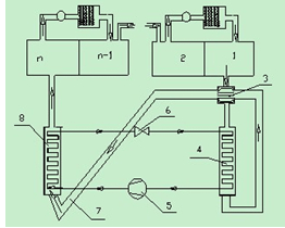 圖中,1為第一段烘箱,2為第二段烘箱,3為烘箱熱風(fēng)與蒸發(fā)器冷凝后氣體的熱交換器,4為熱泵蒸發(fā)器,5為熱泵壓縮機(jī),6為熱泵節(jié)流閥,7為風(fēng)管,8為熱泵冷凝器。