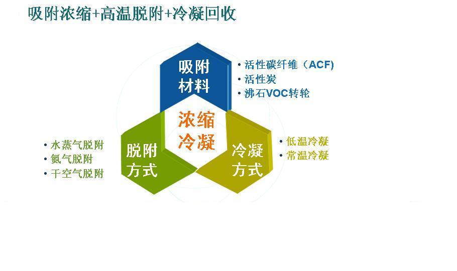 對于車間24小時連續(xù)作業(yè)、廢氣連續(xù)產(chǎn)生的常規(guī)情況,“ACR有機廢氣回收治理系統(tǒng)”采用多活性炭纖維吸附塔交替運作:車間排放廢氣經(jīng)前級處理降溫、除塵后,經(jīng)閥門通過其中一個吸附器,廢氣中VOCs被ACF的微孔吸附,經(jīng)吸附處理后的廢氣達到排放標(biāo)準后排放。經(jīng)吸附處理后的廢氣達到排放標(biāo)準后排放,排放出來的較低溫、干凈的氣體與客戶設(shè)備排出的高溫廢氣通過高效換熱器得到較高溫的氣體重新回到烘箱,熱能得以回收。另一吸附器經(jīng)閥門連接到脫附回收裝置,脫附回收裝置產(chǎn)生的高溫?zé)峥諝馐笰CF微孔中的VOCs脫附出來,隨空氣循環(huán)送回脫附回收裝置,經(jīng)多級降溫后進入回收系統(tǒng),在低于-30℃以下的低溫下被冷凝成液體得以回收。經(jīng)冷凝回收后的空氣再經(jīng)多級升溫后循環(huán)進入吸附器進行脫附。脫附結(jié)束后,脫附回收裝置送出冷空氣對吸附器進行降溫,降溫完成后通過閥門切換到吸附狀態(tài),同時另一吸附器也被切換進入脫附狀態(tài),如此循環(huán)往復(fù)連續(xù)工作,實現(xiàn)有機溶劑回收及廢氣達標(biāo)排放。