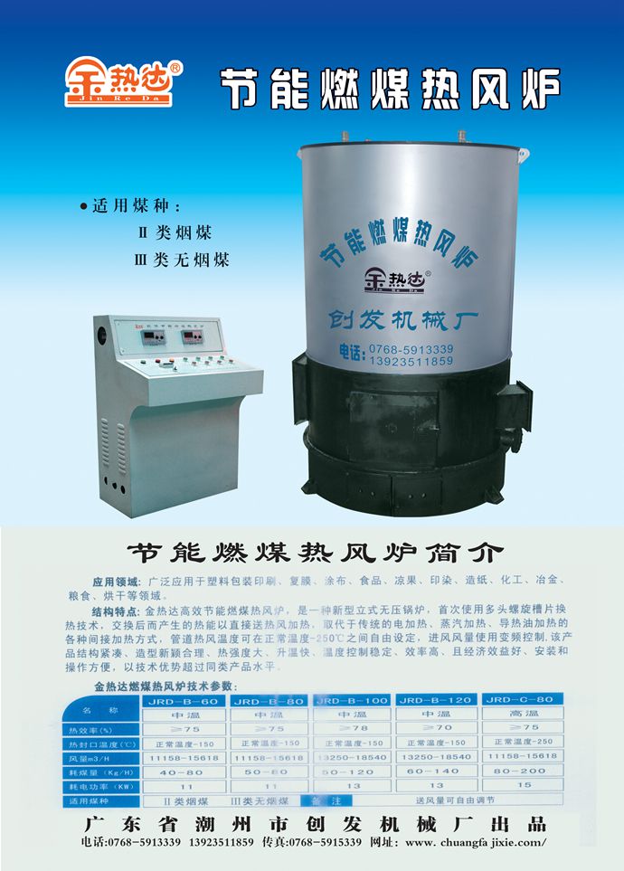 金熱達(dá)高效節(jié)能燃煤熱風(fēng)爐,是一種新型立式無壓鍋爐,首次使用多頭螺旋槽片換熱技術(shù),交換后而產(chǎn)生的熱能以直接送熱風(fēng)加熱,取代于傳統(tǒng)的電加熱、蒸汽加熱、導(dǎo)熱油加熱的各種間接加熱方式,管道熱風(fēng)溫度在正常溫度-300℃之間自由設(shè)定,該產(chǎn)品結(jié)構(gòu)緊湊、造型新穎合理、熱強度大、升溫快、溫度控制穩(wěn)定、效率高、且經(jīng)濟效益好、安裝和操作方便,以技術(shù)優(yōu)勢超過同類產(chǎn)品水平。